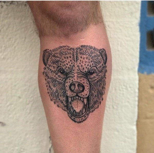 百乐动物纹身 男生小腿上黑色的熊纹身图片