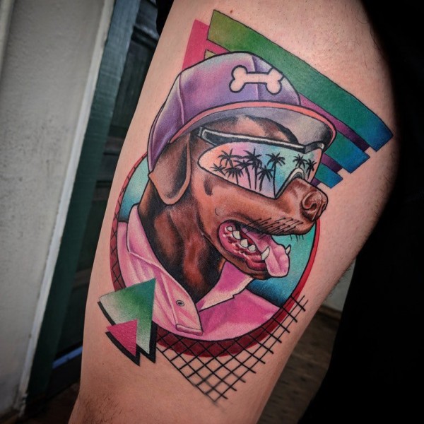 大腿纹身男 男生大腿上度假的小狗纹身图片
