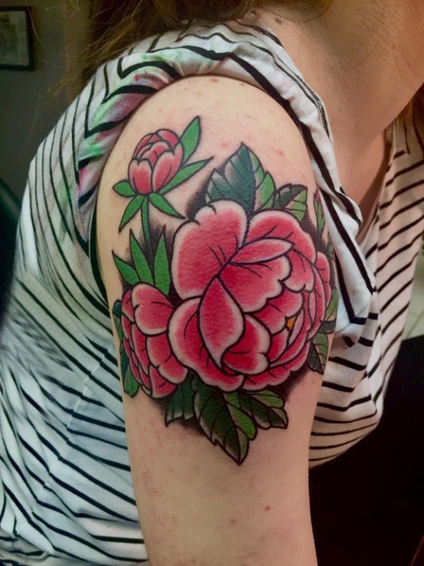 大臂纹身图 女生大臂上彩色的牡丹纹身图片