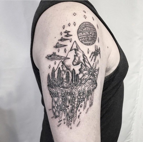 大臂纹身图 男生大臂上星球和森林风景纹身图片