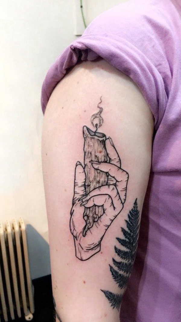 大臂纹身图 男生大臂上手握蜡烛纹身图片