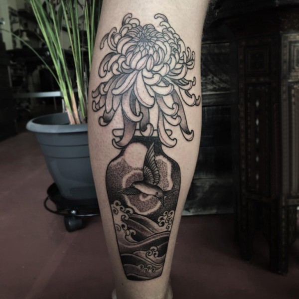 黑灰菊花纹身 男生小腿上黑灰色的菊花纹身图片