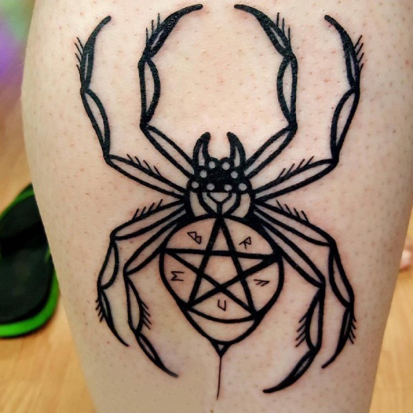 极简线条纹身 男生小腿上黑色的蜘蛛纹身图片