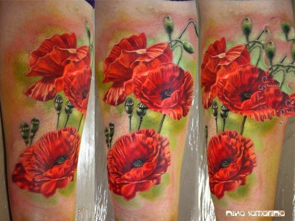 罂粟刺青:艳丽的一组红色罂粟花纹身图案