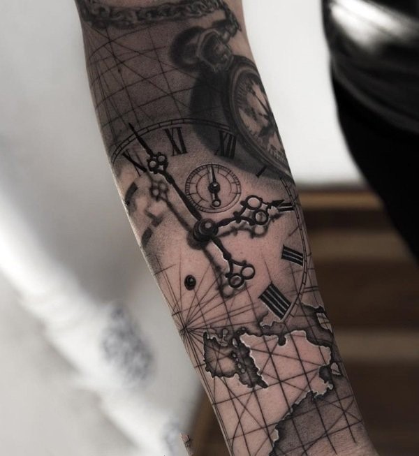 黑臂时钟纹身--一组男士小手臂上的黑臂时钟指南针纹身图案