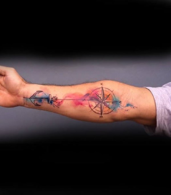 纹身指南针 水彩与线条结合的指南针纹身图案