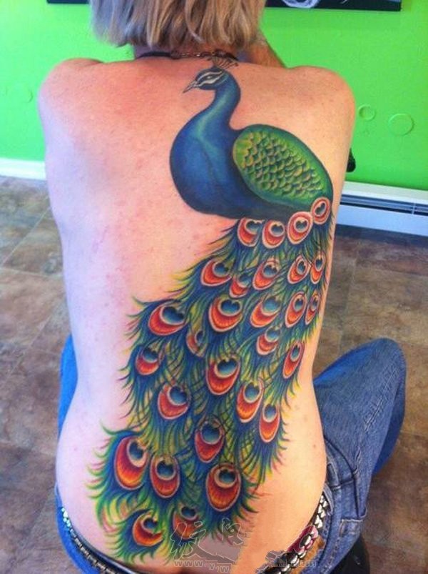 纹身图吧分享一张满背的彩色创意孔雀文身作品