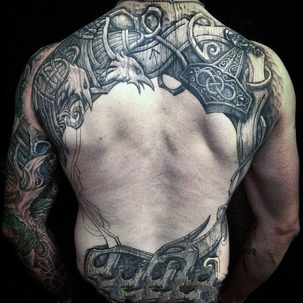 新传统风格的9张男性黑灰大满背纹身图案图片