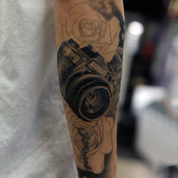 手臂胳膊上的欧美黑灰钟表玫瑰纹身图案9张