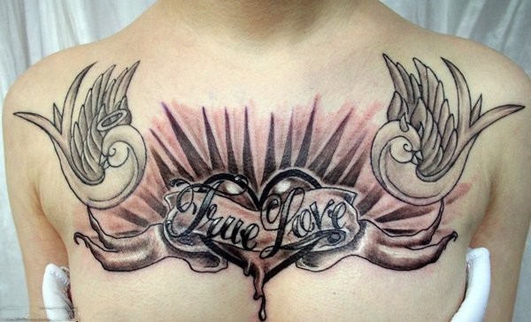 女生锁骨下黑灰素描点刺技巧创意比心纹身图片
