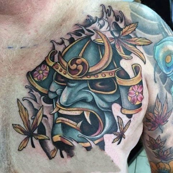日本武士面具纹身 面容凶狠的日本武士纹身图案
