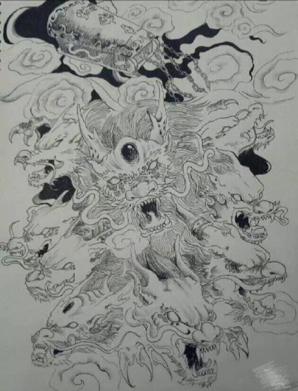 一组满背大气九龙拉棺纹身图案作品和手稿