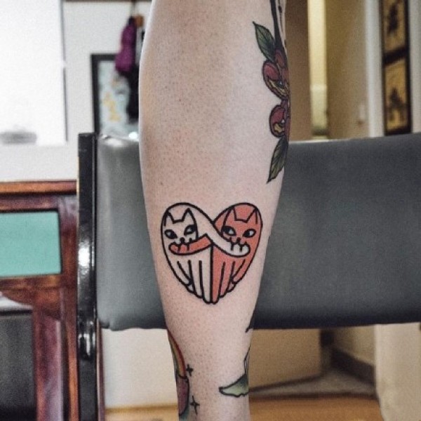 腿部红色桃心纹身