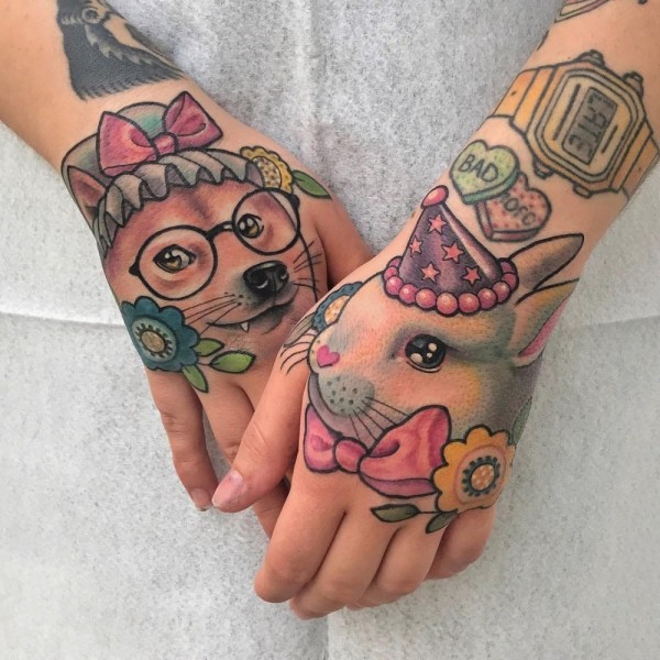 手背上纹身图案 手背上素描纹身黑白灰风格和彩绘纹身风格的动物纹身及花纹身图案