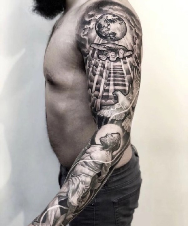 欧美花臂纹身_22张霸气黑灰欧美大黑花臂纹身图案作品图片
