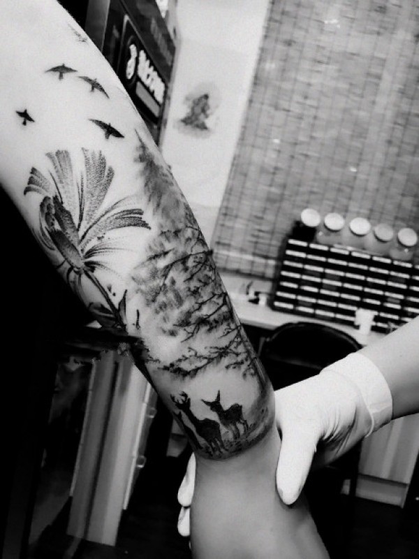 森林树木纹身图案_一组手臂上黑灰树木森林纹身图案作品
