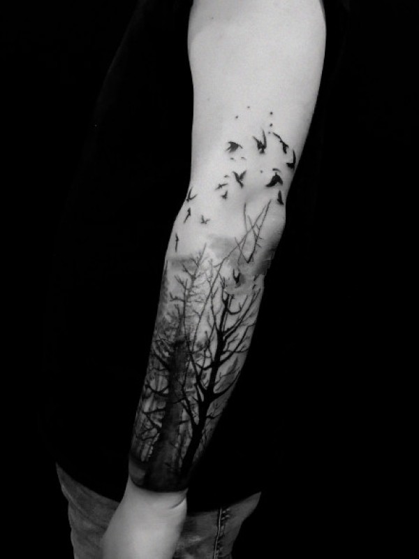 森林树木纹身图案_一组手臂上黑灰树木森林纹身图案作品