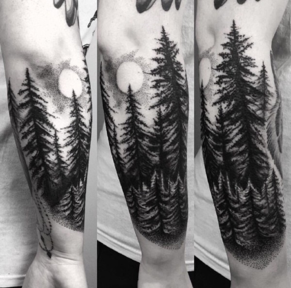 森林树木纹身图案_一组手臂上黑灰树木森林纹身图案作品