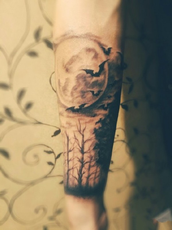 森林树木纹身图案_一组手臂上黑灰树木森林纹身图案作品
