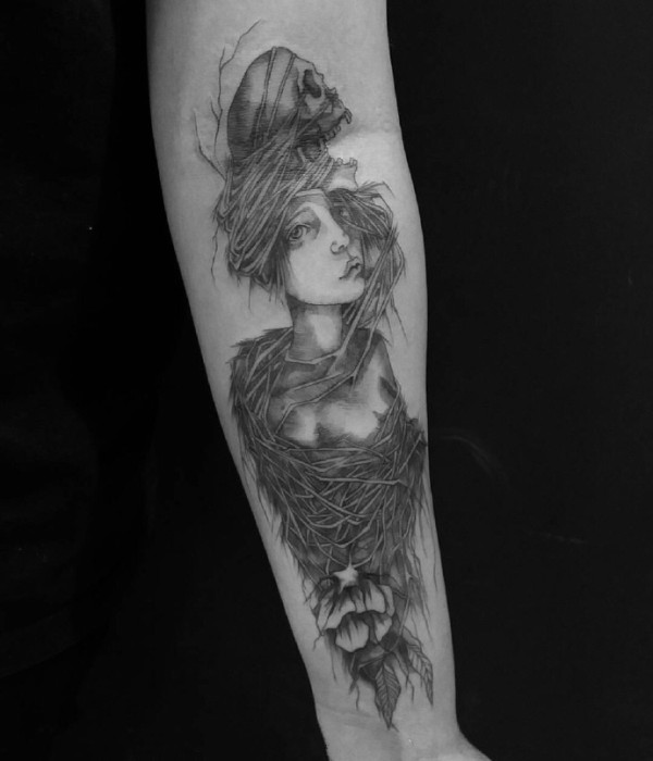 手臂插画纹身_9张黑灰手臂上的插画纹身图案作品图片