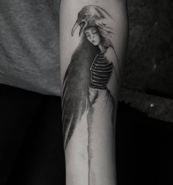手臂插画纹身_9张黑灰手臂上的插画纹身图案作品图片