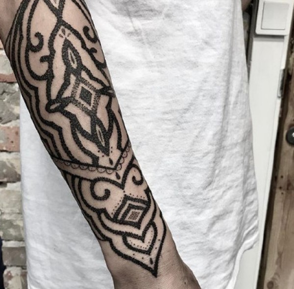 点刺大黑花臂纹身_9张点刺风格的大黑臂纹身图案作品图片