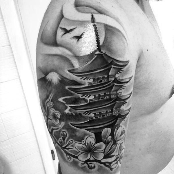 手臂纹身-宏伟壮丽的素描手臂塔纹身图案