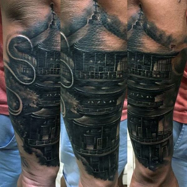 手臂纹身-宏伟壮丽的素描手臂塔纹身图案