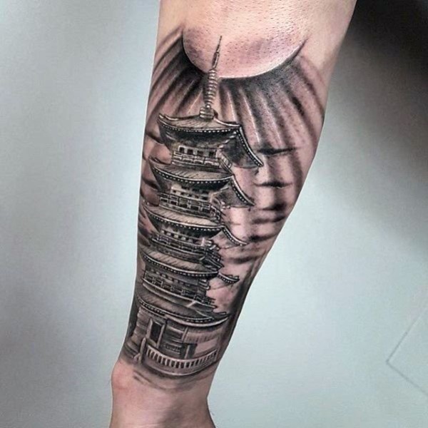 手臂纹身-宏伟壮丽的素描手臂塔纹身图案
