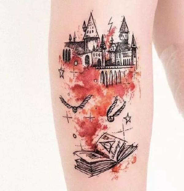 女性大腿上的哈利波特的灵感猫头鹰纹身图案