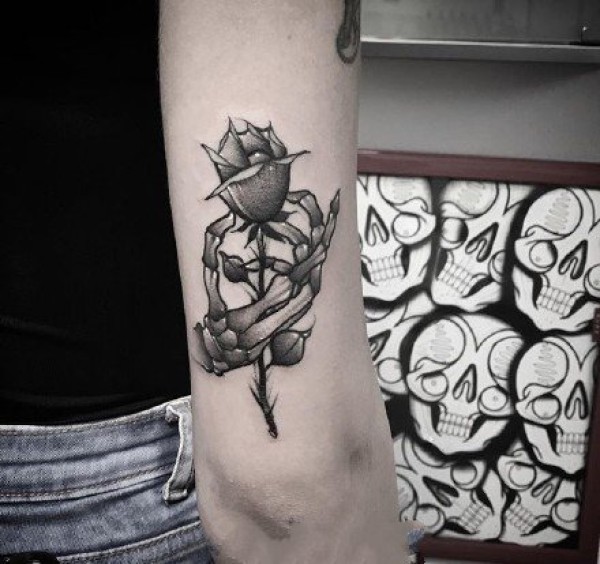 黑灰色玫瑰花和骷髅头纹身图片手稿
