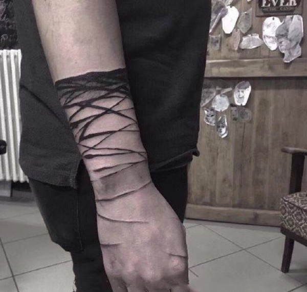 手臂纹身图案-黑丝线条缠绕在手上的手环纹身图片