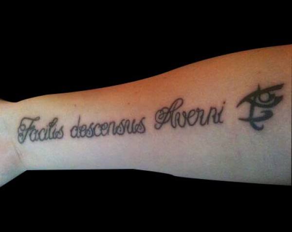 手臂黑色刀剑与拉丁文纹身图案