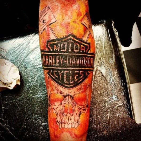男生手臂上彩绘水彩素描创意霸气摩托车纹身图片