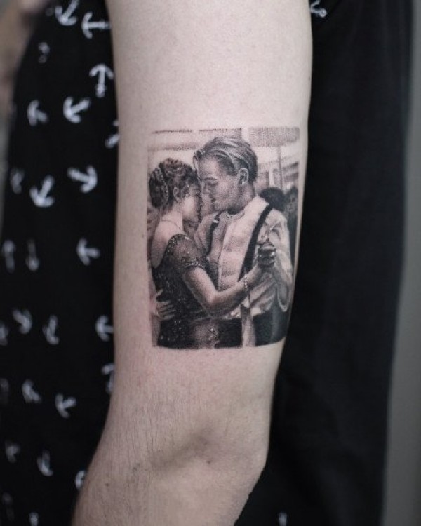 纹身照片 女生大臂上彩色的情侣结婚照纹身图片