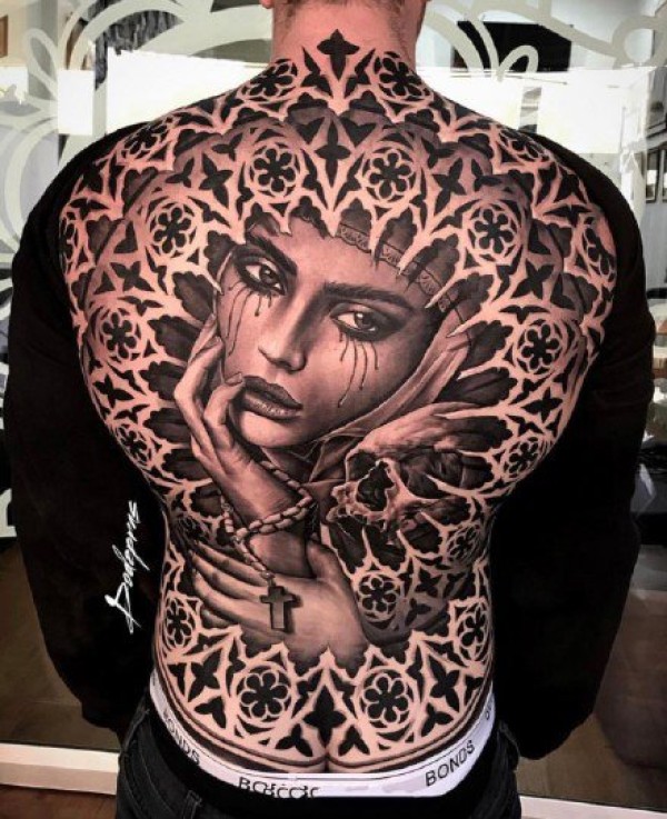 新传统风格的9张男性黑灰大满背纹身图案图片