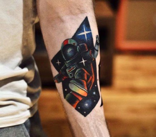 手臂纹身图片 男生手臂上彩色的宇航员纹身图片