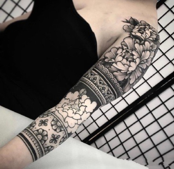 漂亮的黑灰色曼陀罗花臂纹身图案