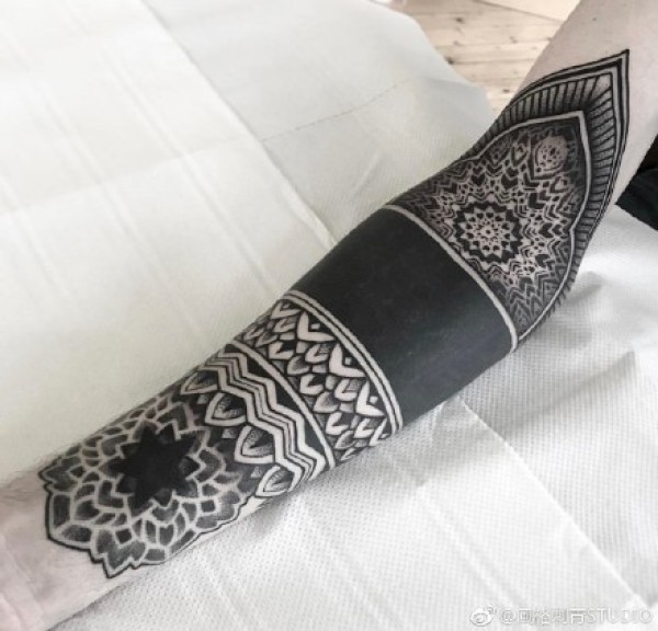 迷人的黑灰色曼陀罗图案纹身来自于纹身师曼纽尔