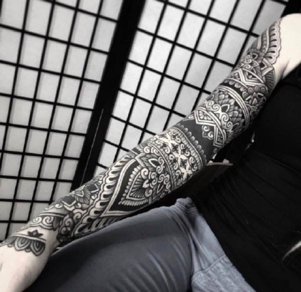漂亮的黑灰色曼陀罗花臂纹身图案