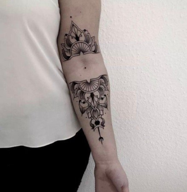 手背到小臂上的黑色点刺梵花纹身图案9张