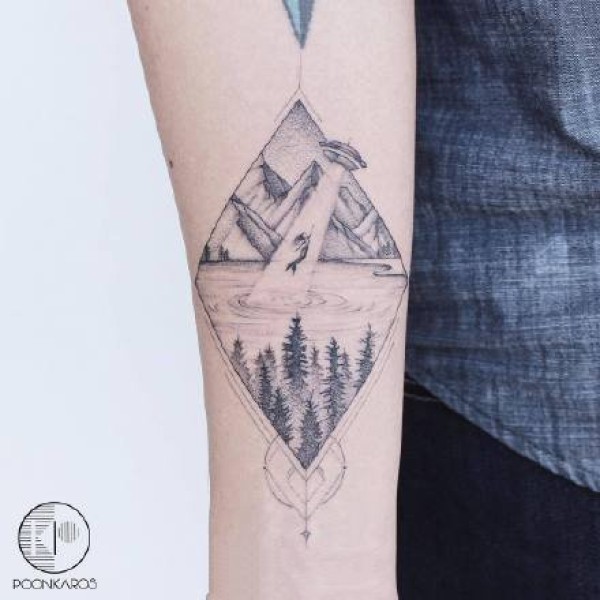 适合手臂上好看的极简线条点刺黑灰纹身作品