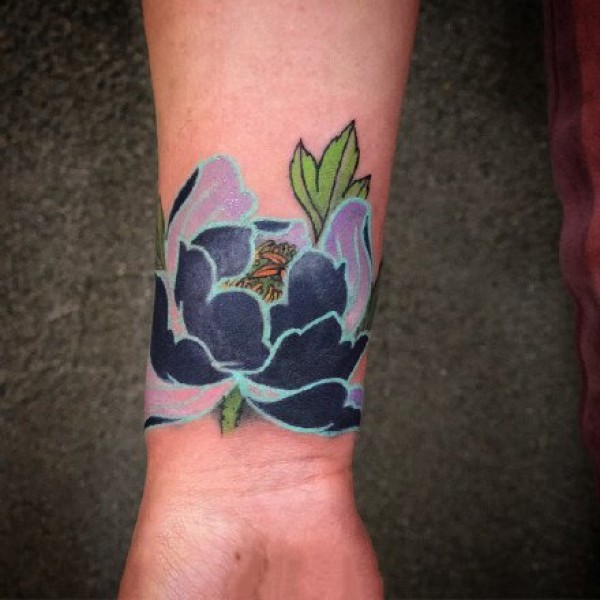 纹在手臂胳膊上的黑灰素花花卉纹身图案欣赏
