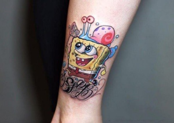 海绵宝宝纹身图案 女生小腿上彩色的海绵宝宝纹身图片