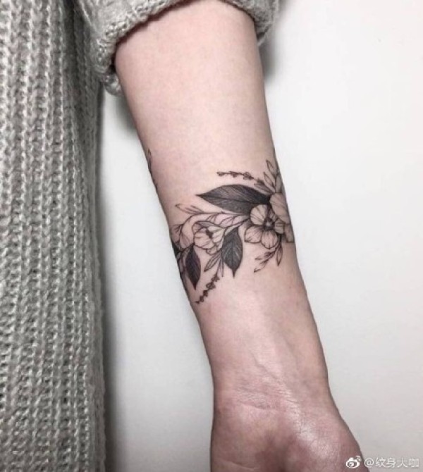 缠绕在小手臂手腕上的花藤纹身图案作品