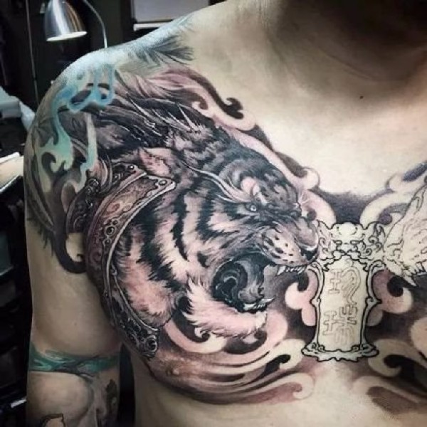 几张漂亮的胸前半甲的肩部老虎纹身图案