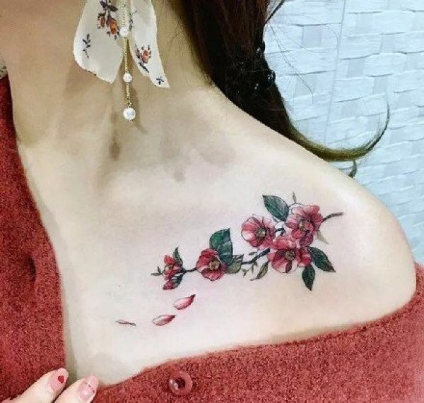 女生锁骨下的唯美花朵纹身图案