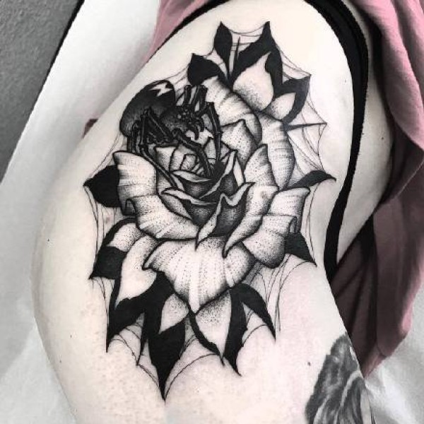 黑灰色玫瑰花和骷髅头纹身图片手稿