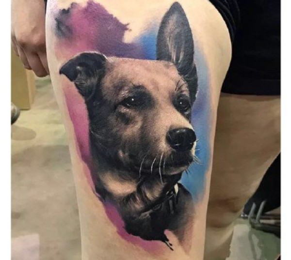 大腿纹身图女 女生大腿上彩色的小狗纹身图片