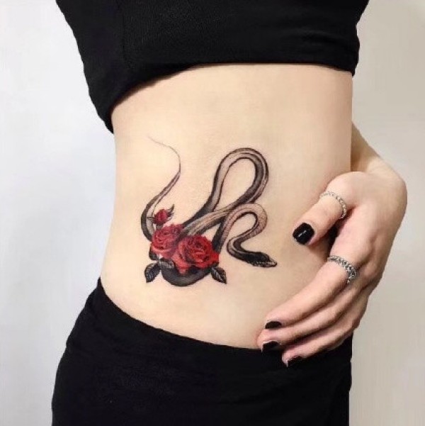 精美的小黑蛇与红色花朵的纹身图案作品图片
